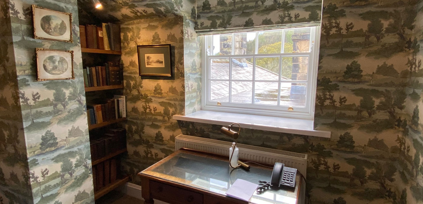 Gable room on the second floor, beams, sloping roof, limited view but a good excuse for those that want to gaze at their partner, lovely period watercolours, contemporary and efficient bathroom.